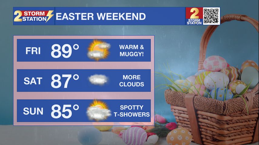 Easter Weekend: After a warm and muggy start Saturday, temperatures will warm into the middle and upper-80s throughout the day, despite mainly cloudy conditions. Breezy winds and elevated humidity levels will continue, but no rain is expected during the first half of the weekend.